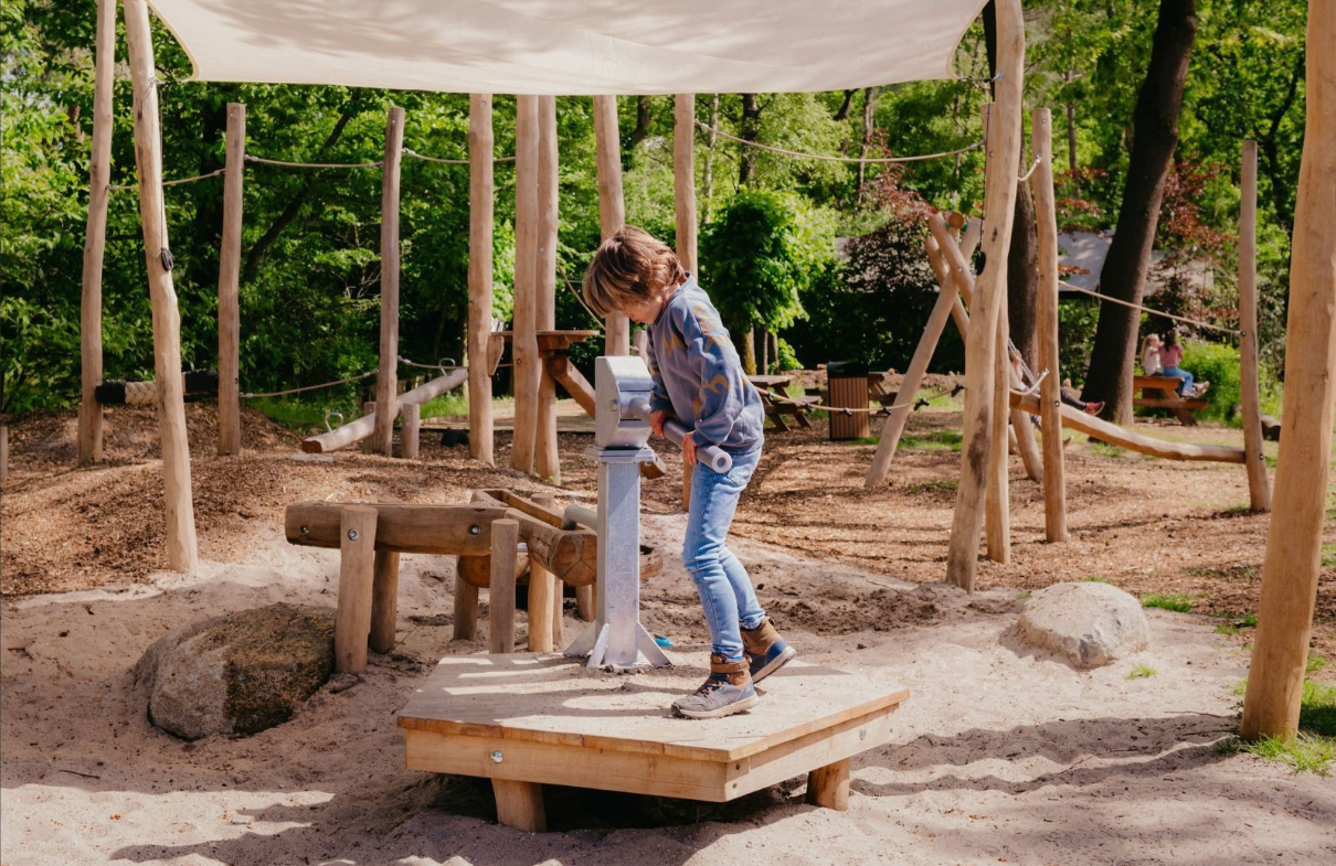 Dit is een topper voor actieve kids! Midden in het bos ligt een natuurlijke speeltuin waar kinderen zich helemaal kunnen uitleven: klimmen, klauteren, hutten bouwen, slingeren, springen... alles mag. Geen plastic toestellen, maar boomstammen, touwen en zand. Terwijl de kinderen spelen, kunnen ouders relaxen op een bankje of mee het bos in.